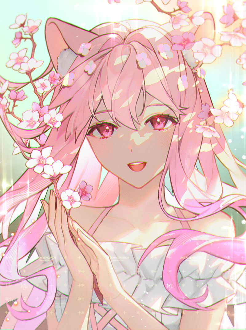 :d1girlanimal ear fluffanimal earsbare shouldersblushcat earscat girlcherry blossomscollarbonedaydresslong hairlooking at vieweroff shoulderoff-shoulder dressopen mouthoutdoorsown hands togetherpink eyespink hairsmilesoloupper bodywhite dress