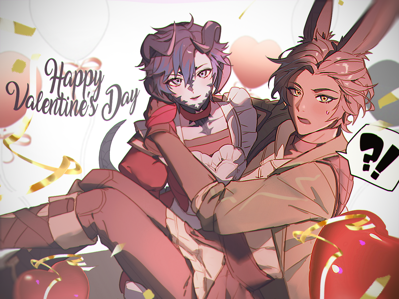 1boy1girlanimal earsapronau rabootsbrown bootsbrown glovesbrown hairbrown pantsbrown shirtclosed mouthdark skindark-skinned maledragon girldragon hornsdragon taildressfeet out of framegloveshornshugjuliet sleeveslong sleevesopen mouthpantspuffy sleevespurple eyespurple hairrabbit boyrabbit earsred dressshirtshort hairsittingsmilespoken interrobangsweatdroptailvalentinevierawhite apronwhite backgroundyellow eyes