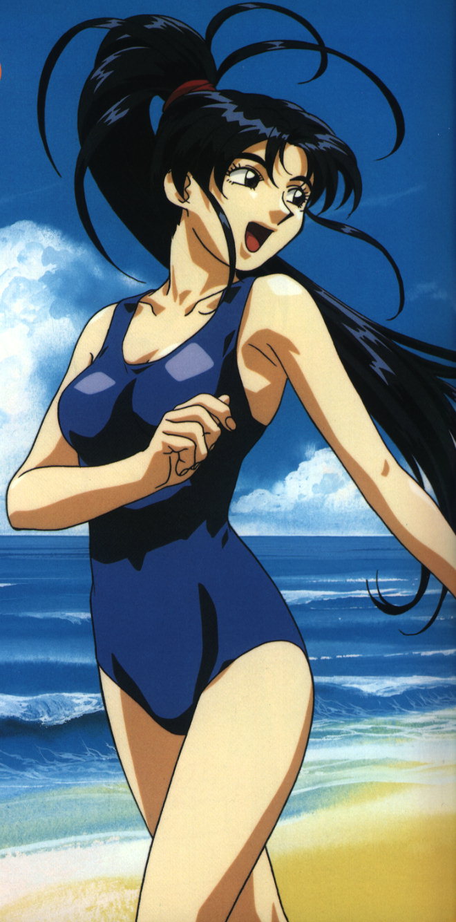 1990s (style)1girlbeachblack hairclouddayfemale focuslong hairoceanone-piece swimsuitoutdoorsponytailretro artstylesoloswimsuit