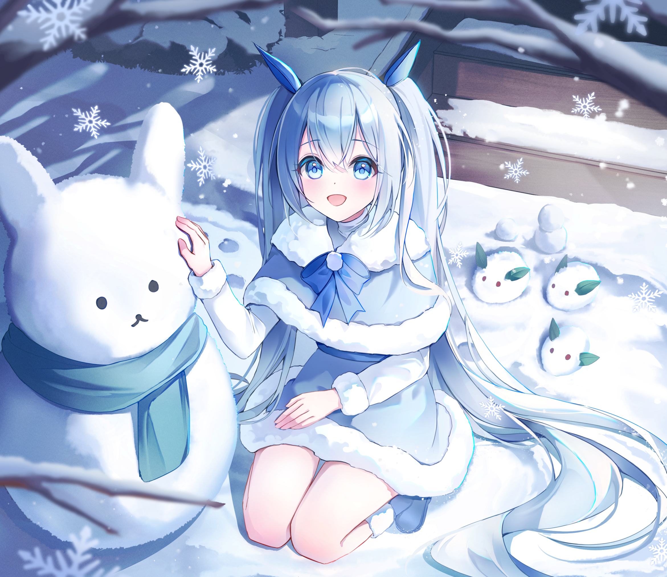 1girlabsurdly long hairaqua eyesaqua hairblushbootscapeletdressfur trimfur-trimmed bootsfur-trimmed capeletfur-trimmed dressfur-trimmed sleeveshair ornamentkneelinglong hairlong sleeveslooking at vieweropen mouthsmilesnowsnow rabbitsnowflakessolotwintailsvery long hair