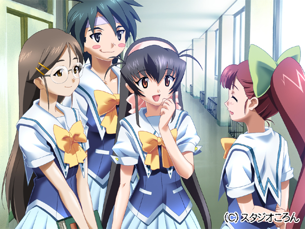 :d1boy4girlsahogeblue hairblushblush stickersbookbowbowtiebrown hairclosed eyescowboy shotglasseshair ornamenthaircliphallwayheadbandindoorsmultiple girlsopen mouthpleated skirtponytailred hairrimless eyewearround eyewearschoolschool uniformserafukushort sleevesskirtsmilespiked hairv armswhite skirtyellow bowyellow bowtie