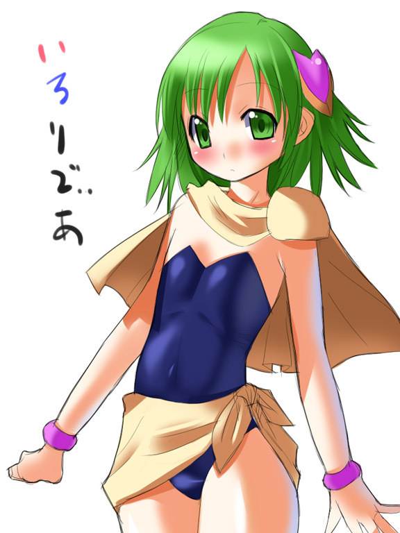 1990s (style)1girlaged downblushcapechildfemale focusflat chestgreen eyesgreen hairleotardmatching hair/eyesretro artstylesimple backgroundsolo