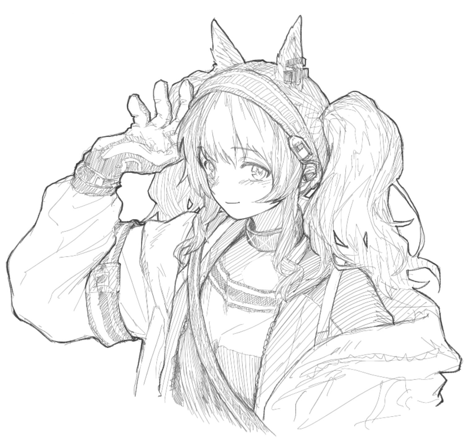 1girlanimal earscoatcollarearpieceextra earsfox earsfox girlglovesgreyscalehairbandhand upjacketlong sleeveslooking at viewermonochromeopen clothesopen coatopen jacketshirtsimple backgroundsketchsmilesolostriped clothesstriped hairbandtwintailsupper bodywhite background