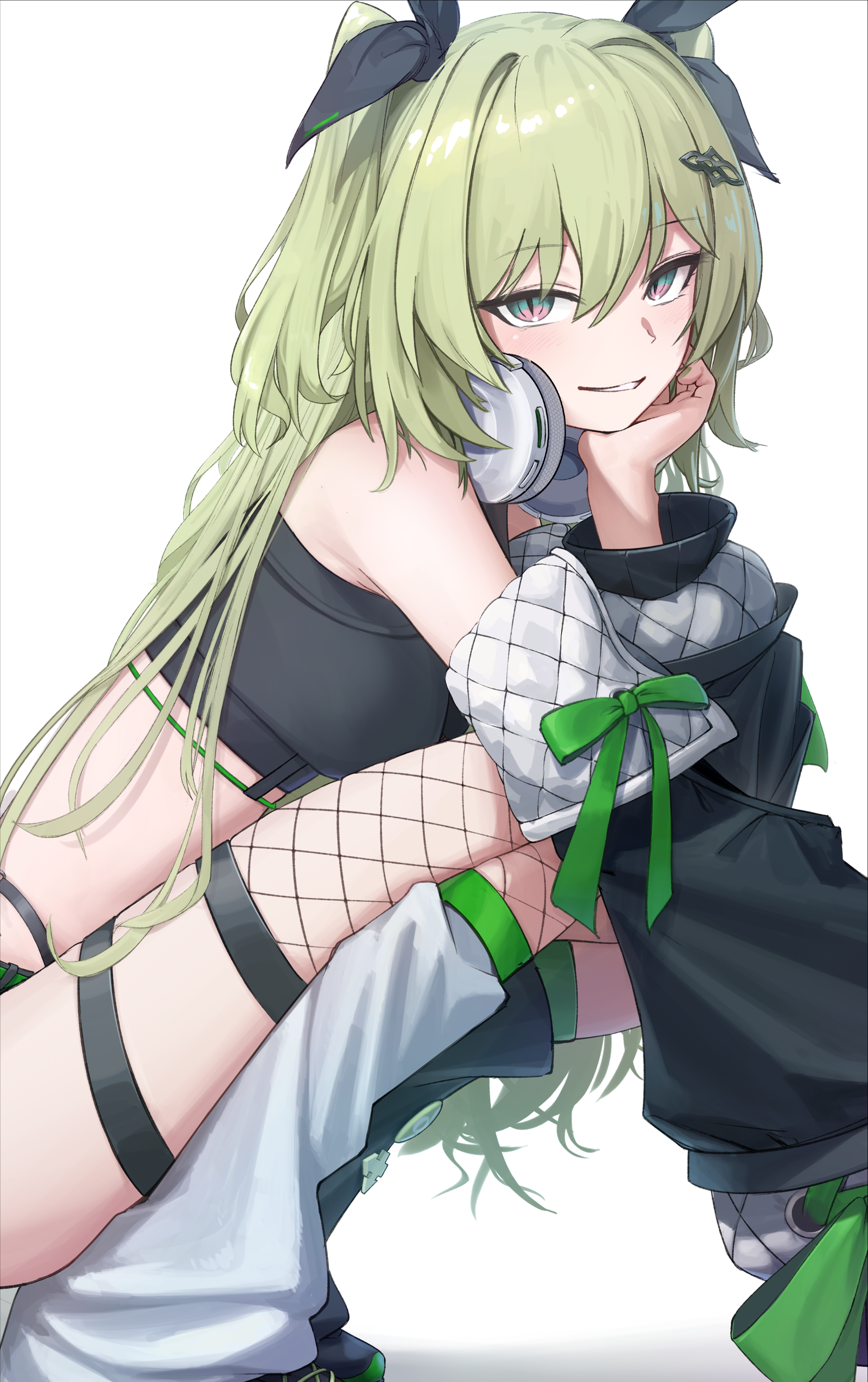 1girlasymmetrical legwearblack leg warmersblack sports brabowdetached sleevesfishnet thighhighsfishnetsfrom sidegreen bowgreen eyesgreen hairheadphonesheadphones around neckleg warmerslong hairlooking at viewerlooking to the sidemismatched legwearmulticolored eyesofficial alternate costumeofficial alternate hairstyleparted lipspink eyessimple backgroundslit pupilssmilesolosports brasquattingthighhighstwo side uptwo-tone eyeswhite backgroundwhite leg warmers