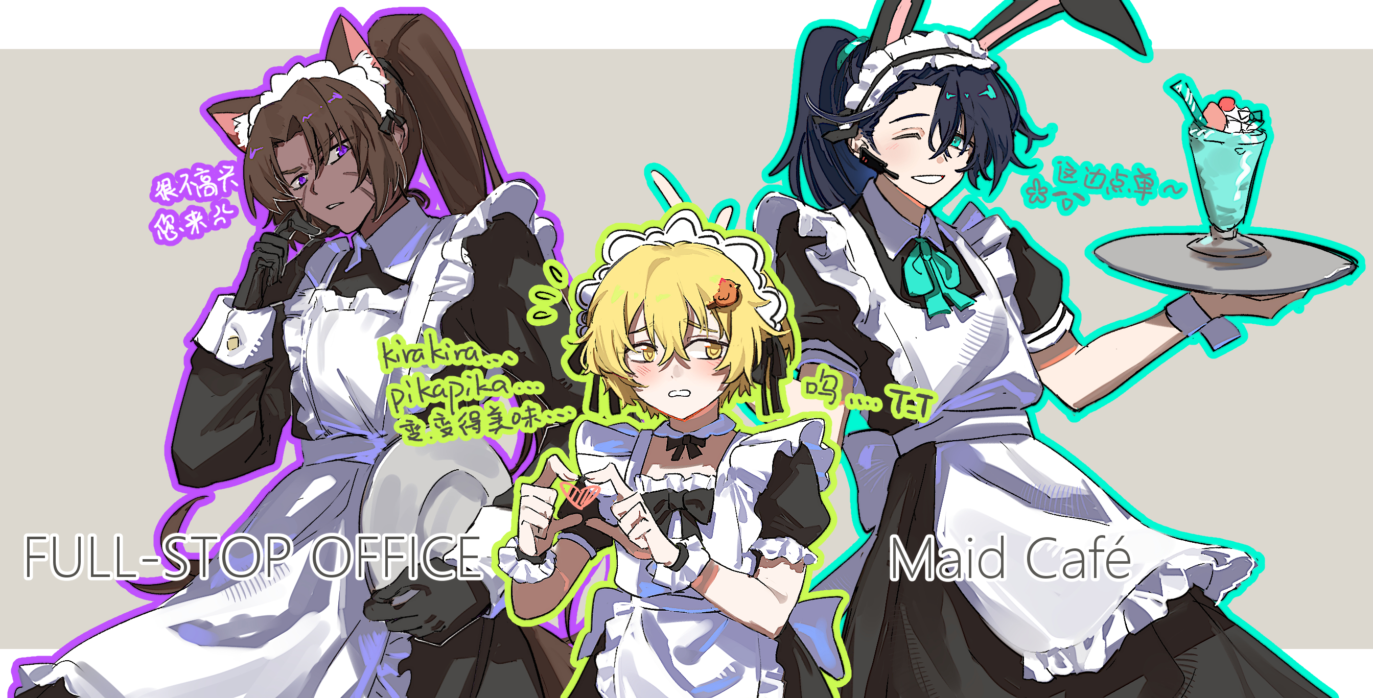 3boysalternate costumeanimal earsapronblack bowblack dressblack glovesblack hairblonde hairblue bowblue bowtieblue eyesborderbowbowtiebrown haircat boycat earscrossdressingcrossdressing (mtf)dark skindark-skinned maledressearpieceenmaidedfull-stop office (identity) (project moon)glovesgrey backgroundhair ornamenthairclipheartheart handshigh ponytailholdingholding traylong hairlong sleeveslooking at viewermaidmaid headdressmale focusmale maidmultiple boysone eye closedponytailpuffy short sleevespuffy sleevespurple eyesrabbit boyrabbit earsscarshort hairshort sleevessimple backgroundstandingtrayupper bodywhite apronwhite borderwrist cuffs