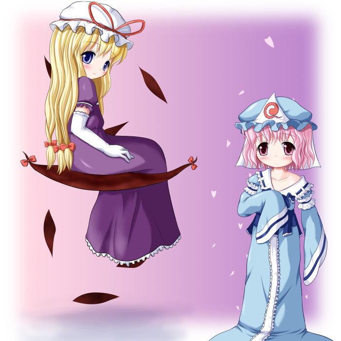 2girlsage regressionaged downblonde hairchildelbow glovesfemale focusgap (touhou)glovesgradient backgroundhatjapanese clotheskimonolong hairlong sleevesmultiple girlsoversized clothespink hairribbonshort hairsittingsleeves past wristsstanding