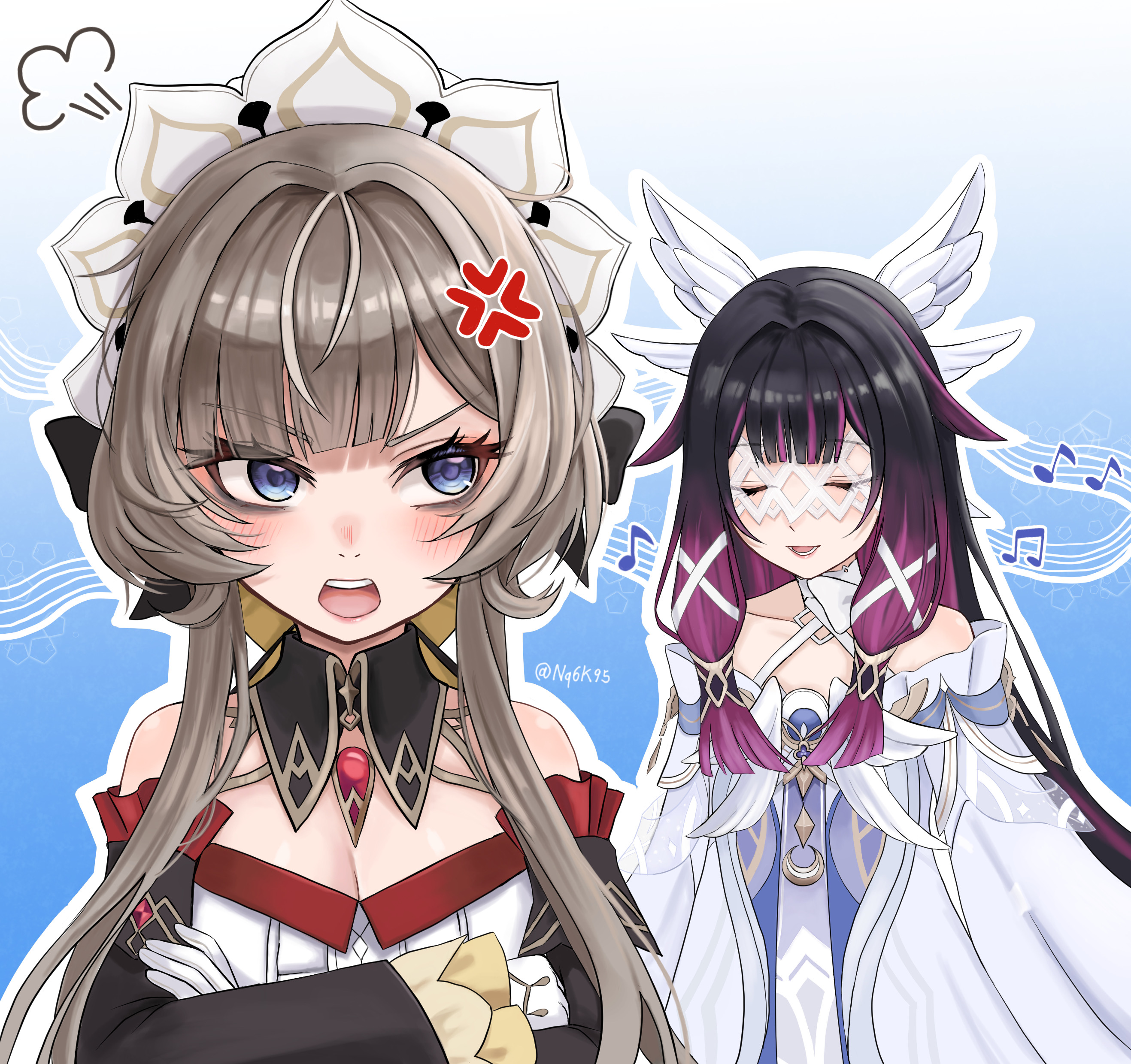 2girlsanger veinangryblack hairblue eyesblushbonnetbreastsbrown haircleavageclosed eyescrossed armsdetached collardressfeathered wingsgloveshead wingslooking at anothermedium breastsmulticolored hairmultiple girlsmultiple wingsmusical notemusical staffnq6k95open mouthpink hairsmilestraplessstrapless dresswhite dresswhite gloveswings