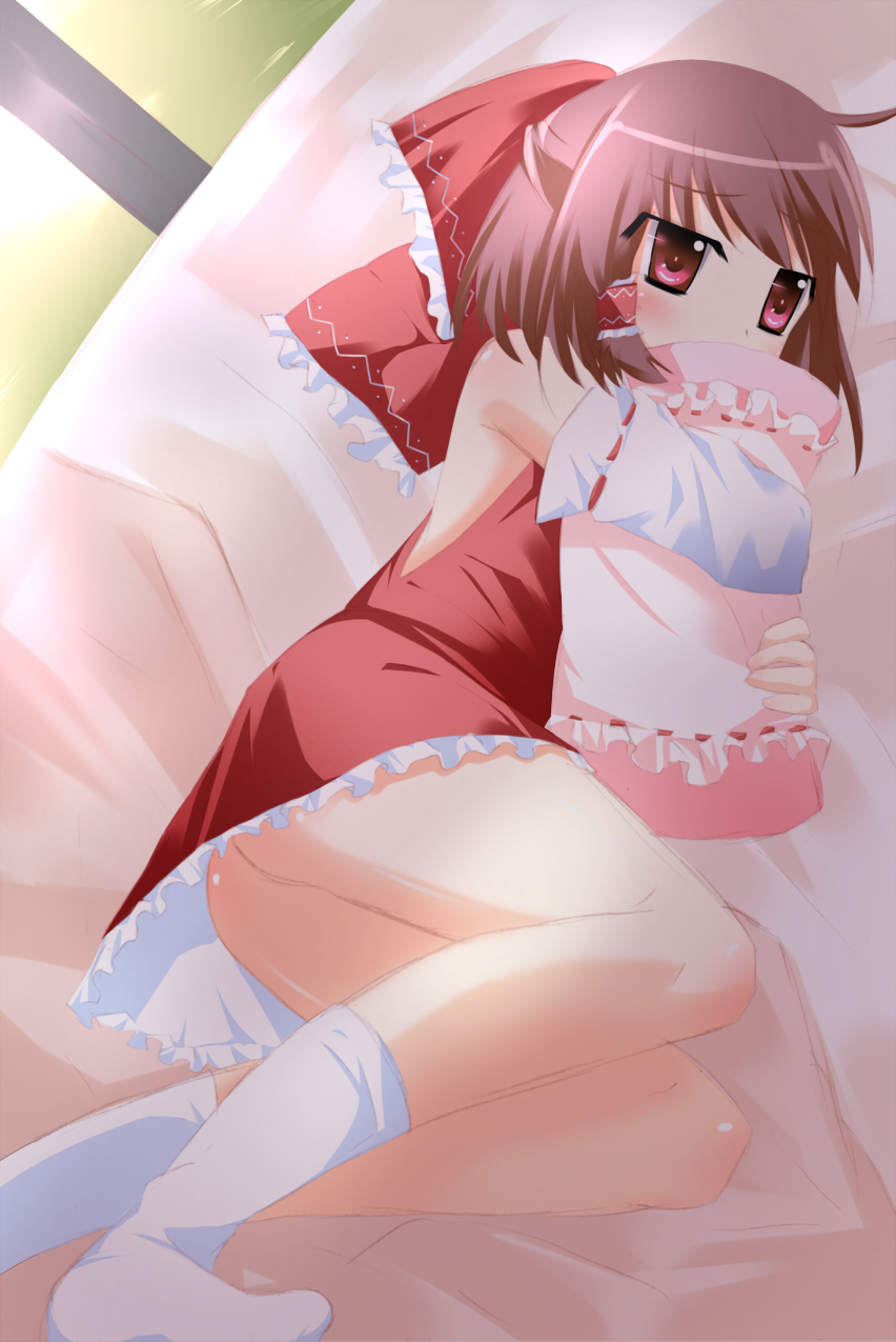 itou chika, ichigo mashimaro, artist request, translation request, 1girl, anus, black eyes, black hair, blush, bottomless, embarrassed, face in pillow, female focus, hair bobbles, hair ornament, hugging object, legs, loli, no panties, pillow, pillow hug, pussy, short hair, side ponytail, sitting, socks, solo, spread legs, sweater, uncensored