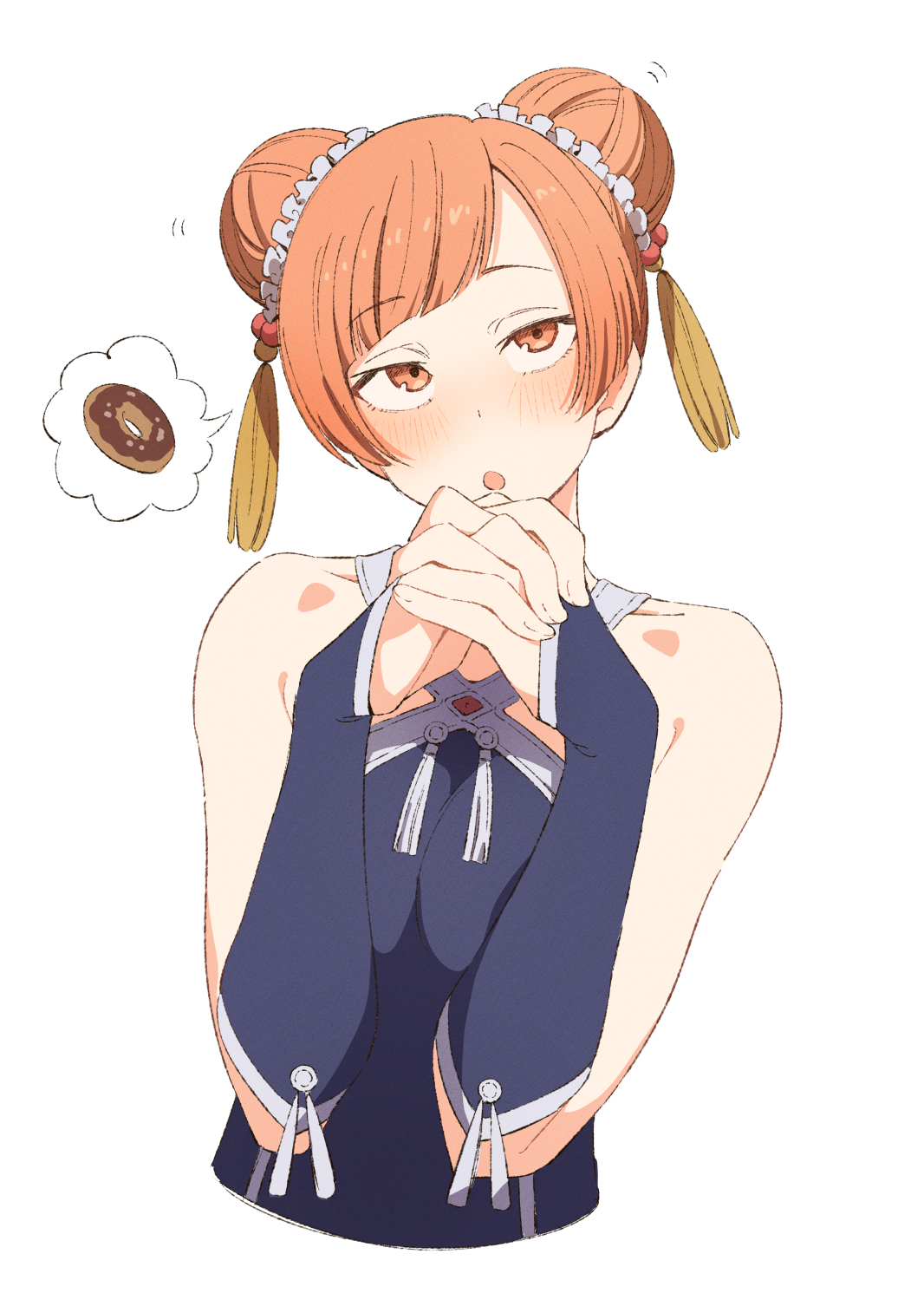1girlbare shouldersbrown eyesbrown hairdonutdouble bunfoodhair buninterlocked fingersown hands togethershort hairsimple backgroundsleevelesssolospeech bubbleupper bodywhite background