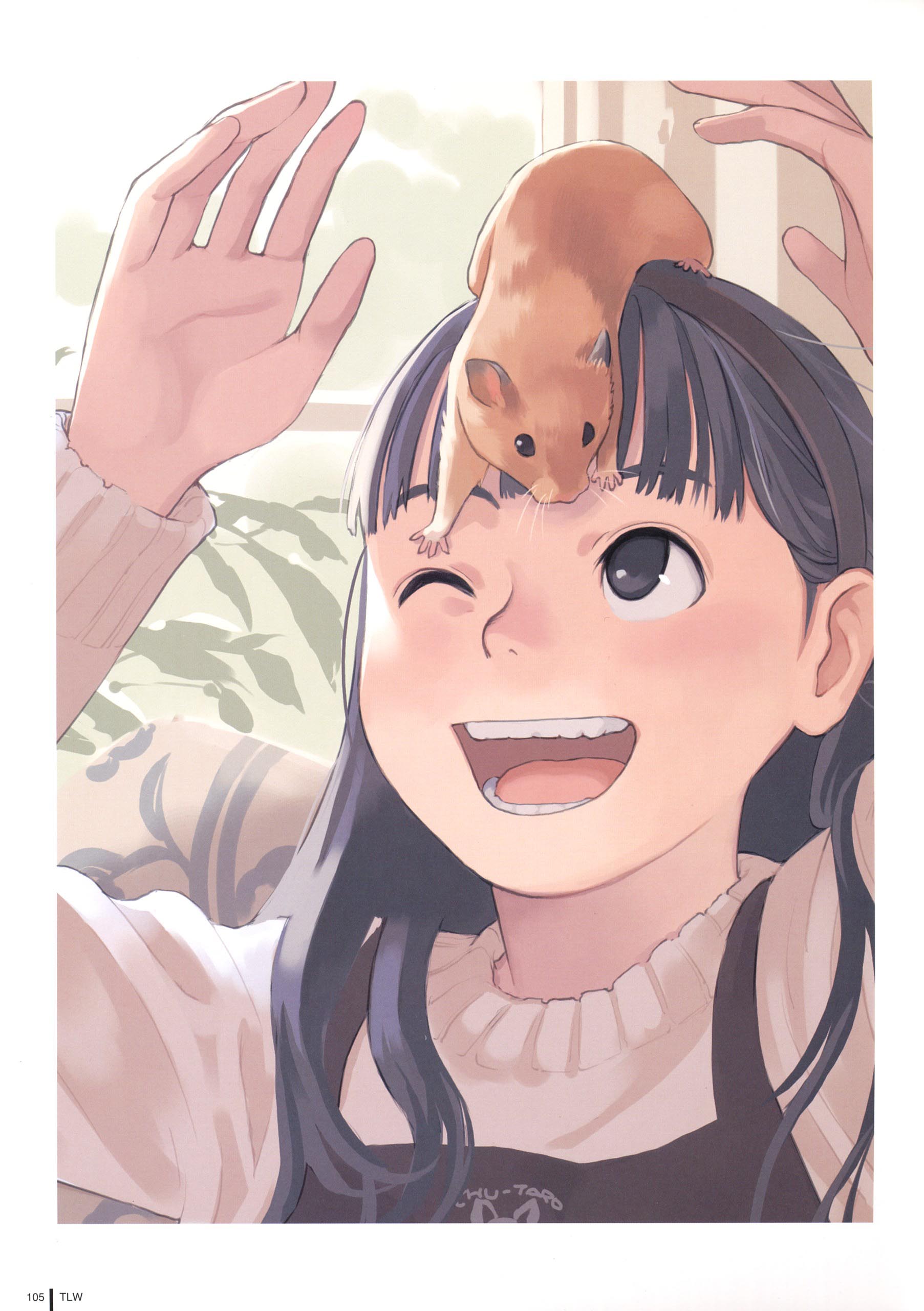 1girlblack eyesblack hairfemale focushamsterlong hairobject on headone eye closedpale colorsmilesolosweaterwink