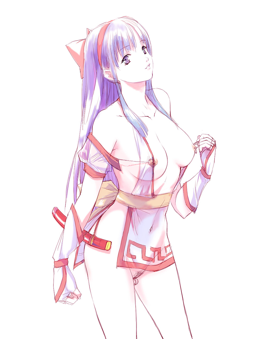 bowcollarbonefemalefingerless glovesFlag for Deletionfunctionally nudegloveshairbandhairbowjapanese clotheslabia piercinglabia ringslong hairlooking at viewermedium breastsnipple piercingnipple ringsnipplesno pantiespiercingpiercing pullpubic hairpurple eyespurple hairsee throughsmall areolaesolostandingweapon