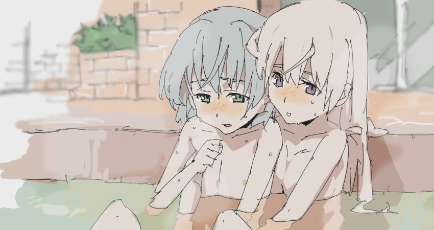 tsukimori hiro, yuuki makoto (radiant), sera kasumi, akiiro renka, purple software, official art, official wallpaper, 00s, 1girl, 2005, ahoge, bikini, bikini bottom only, black bikini, blonde hair, blue eyes, blush, breasts, chair, covering breasts, covering privates, day, drink, drinking straw, female focus, flower, food, fruit, grapes, legs, lounge chair, medium breasts, outdoors, pool, poolside, sitting, smile, solo, swimsuit, topfreedom, topless female, water, watermelon