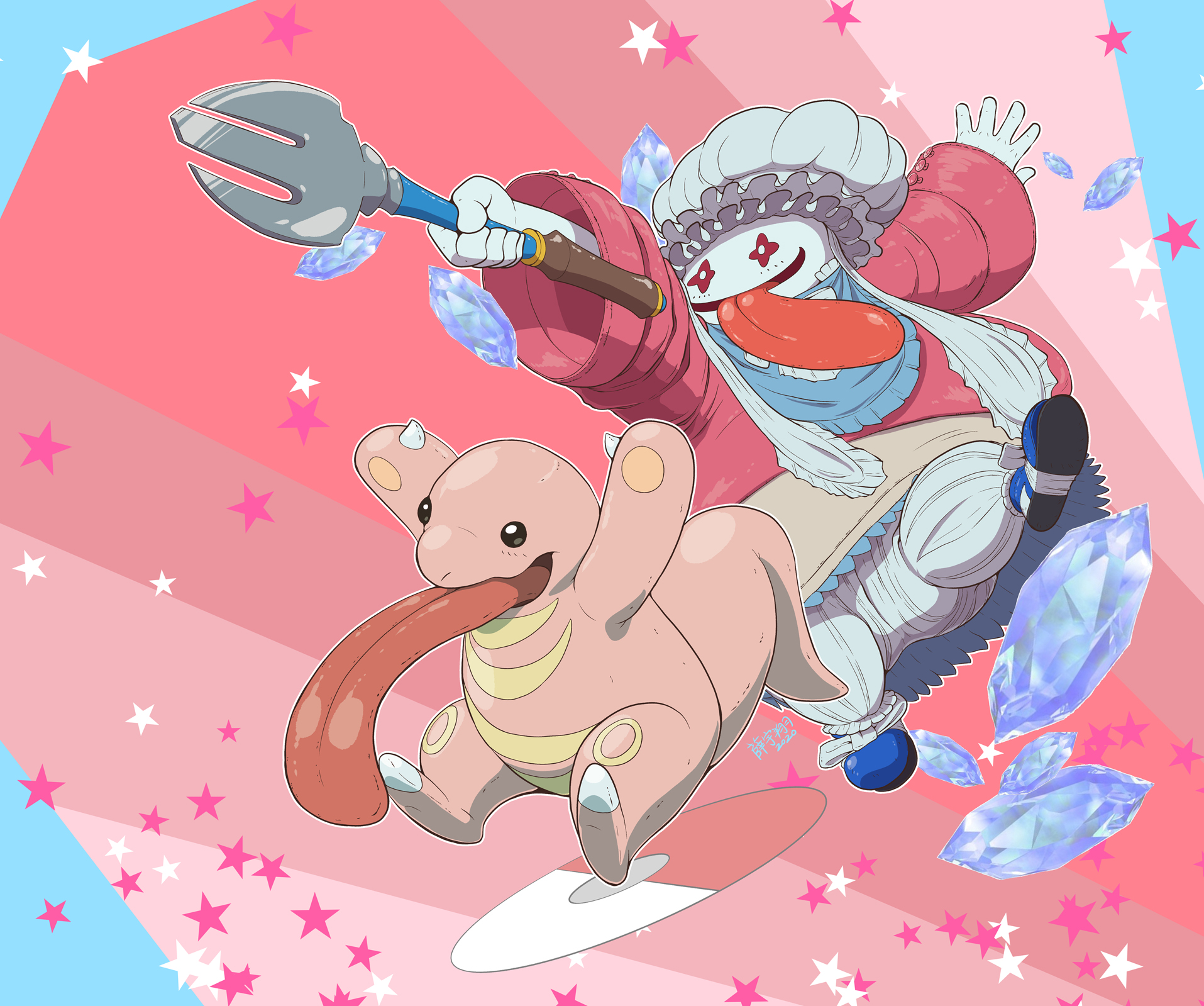 arms upbibblack eyescolored skincrossovergen 1 pokemonhatholdingholding polearmholding weaponice crystalpink backgroundpokemon (creature)polearmred eyestonguetongue outtrait connectiontridentweaponwhite hatwhite skinwhite sleeves