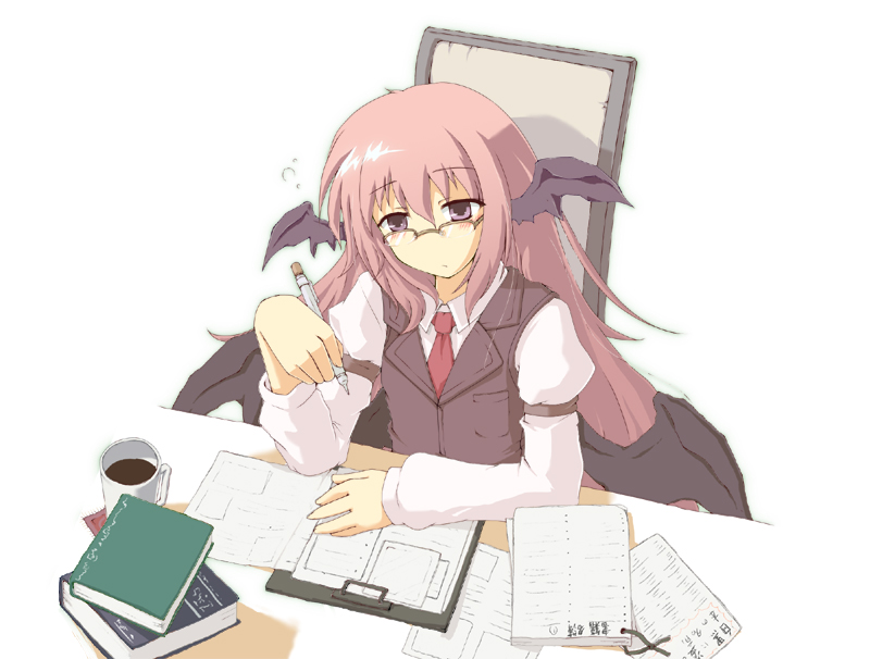 1girlbat wingsbespectacledbookcoffeecupfemale focusglasseshead wingslong hairnecktiepenpink hairpurple eyessittingsolowhite backgroundwings