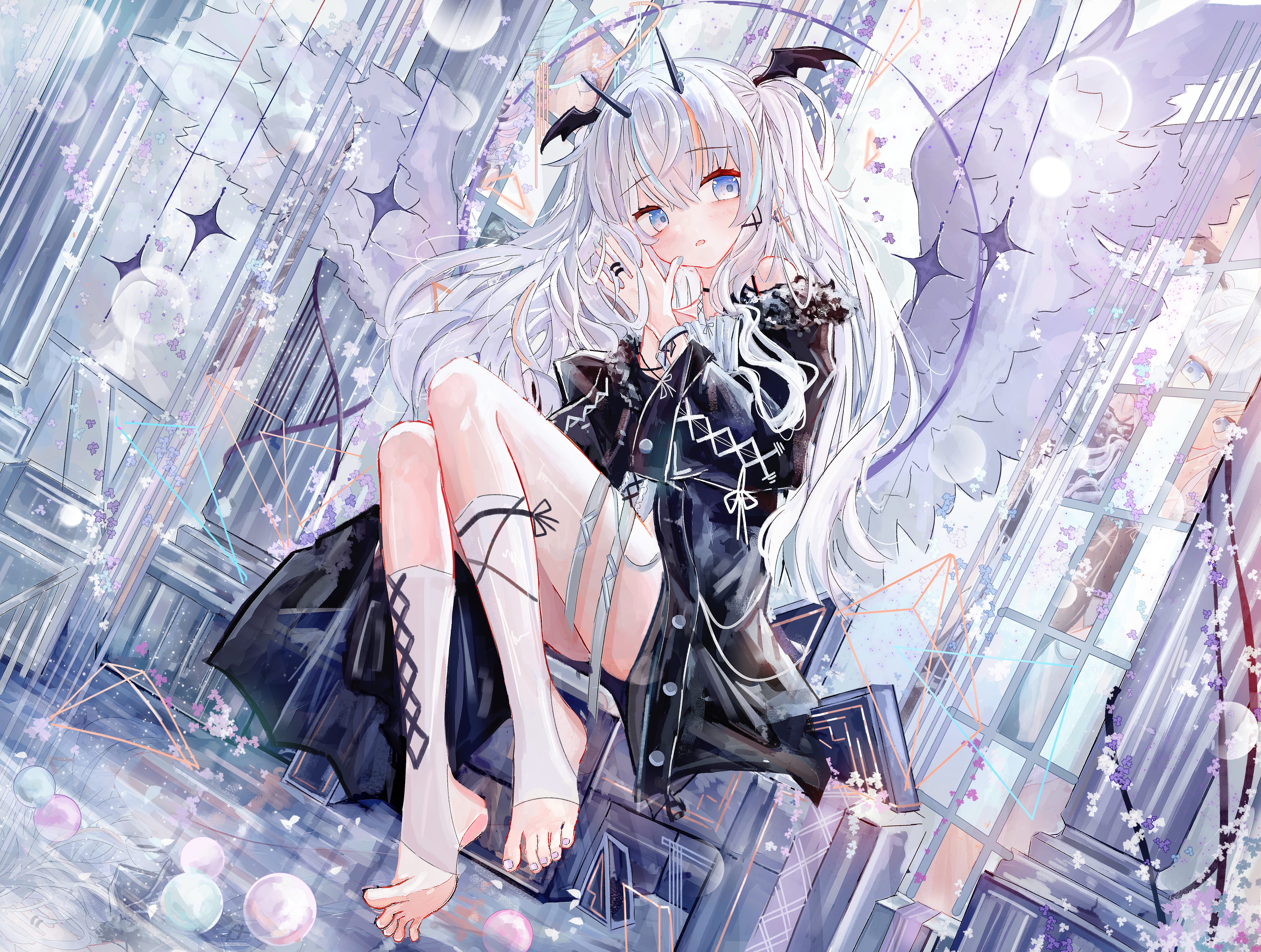 1girlblack hornsblack wingsblue eyesblue nailsdemon hornsdemon wingsfeathered wingshead wingshornskneehighslong hairnail polishopen mouthpurple nailssittingsockssolostirrup legweartoeless legweartoenail polishtoenailstoeswhite hairwhite sockswings