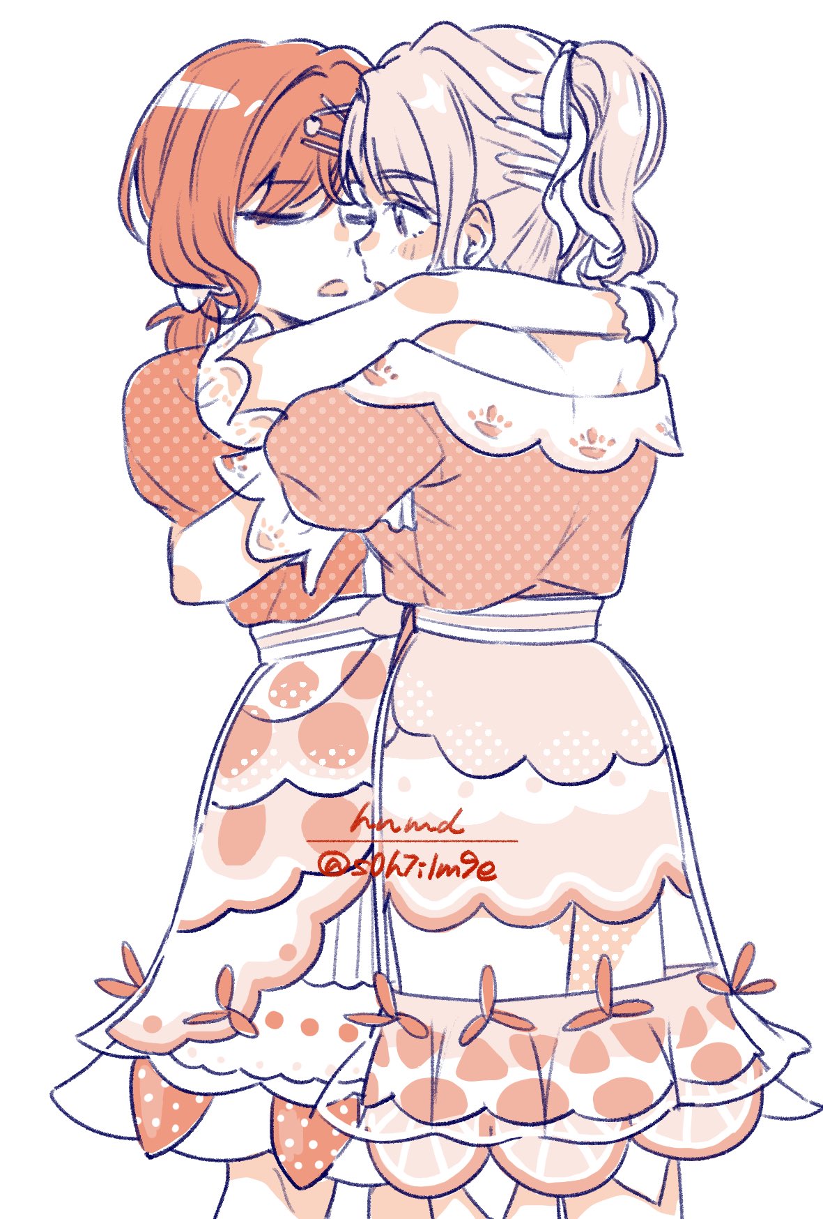 2girlsarms around neckclosed eyesgrey hairhand on another's headmultiple girlsoff shoulderoff-shoulder shirtopen mouthorange hairpink shirtpink skirtponytailshirtsimple backgroundskirttwitter usernamewhite backgroundyuri