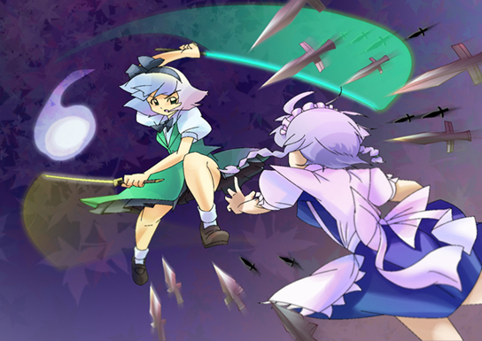 2girlsbattlebreastsdressfemale focusgradient backgroundkatanaknifemaidmultiple girlsswordthrowing knifeweapon