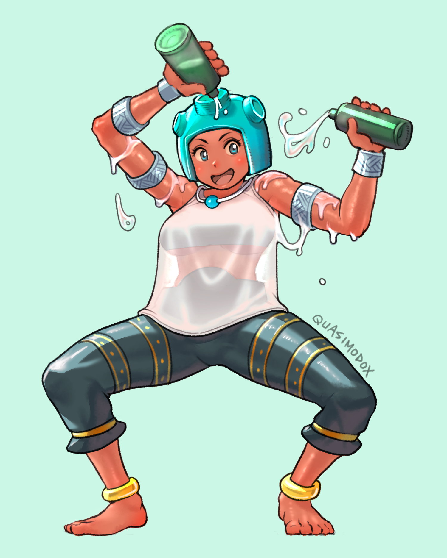 1girlaged upankletarmletbarefootblue hairbottlebraceletbreastsdark skindark-skinned femalejewelrylarge breastsnecklaceopen mouthpouringpouring onto selfsee-through clothessmilesolospread legstank topunderboobwetwet clothes