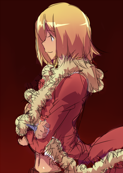 1girlandrogynousblonde hairbrown eyesclosed mouthcoatfemale focusfrom sidefur trimgradient backgroundlong sleevesmidriffnavelshort hairsimple backgroundsmilesoloupper body