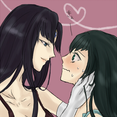 00s2girlsblack hairblushelbow gloveseye contactglovesgreen eyesgreen hairlong hairlooking at anothermultiple girlsstaringsweatyuri