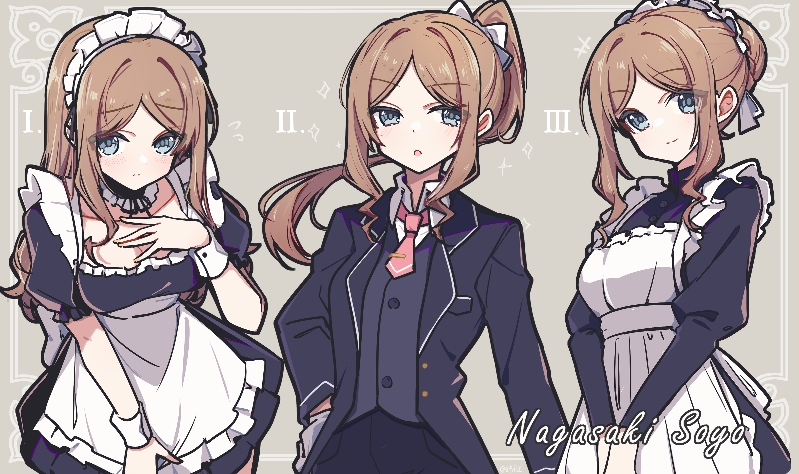 1girlapronblack dressblack jacketblack vestblue eyesbreastsbrown hairdresshand on own chestjacketlarge breastslong hairmaidmaid headdressmale focusopen clothesopen jacketshort hairsidelocksvestwhite apron
