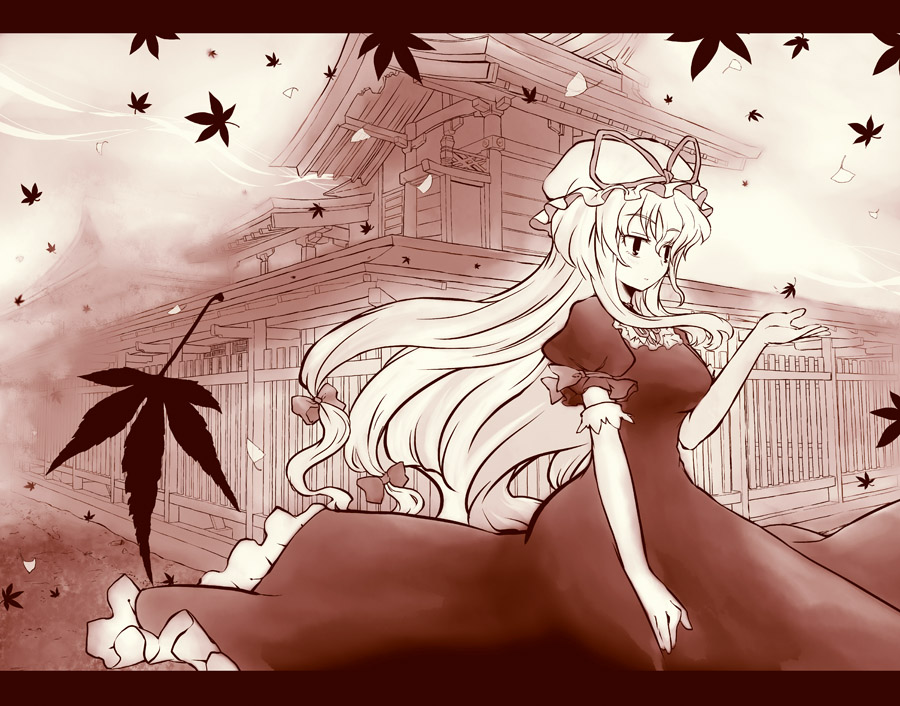 1girlarchitecturebowdresseast asian architectureelbow glovesexpressionlessfemale focusgloveshair bowhatleafletterboxedlong hairmaple leafmonochromesolo