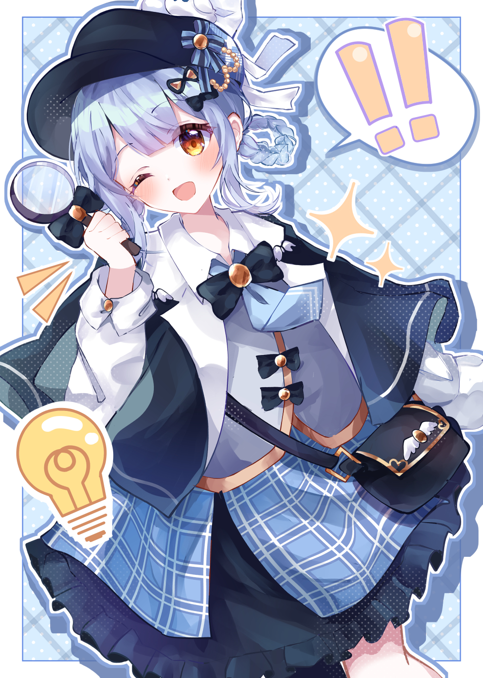 :d1boy1girlblack bowblack capeletblack hatblack pantyhoseblue backgroundblue hairblue necktieblue skirtblushborderbowbraidbraided hair ringscapeletcollared shirtdeerstalkerdetectivefeet out of framefrilled skirtfrillsgrey vesthair bowhair ringshatholdingholding magnifying glasslayered skirtlight bulblong sleeveslooking at viewermagical girlmagnifying glassnecktieone eye closedopen mouthoutside borderpantyhoseplaid clothesplaid skirtpleated skirtshirtshort hairsingle leg pantyhoseskirtsmilesolosparklespoken exclamation markstandingvestwhite borderwhite shirtyellow eyes