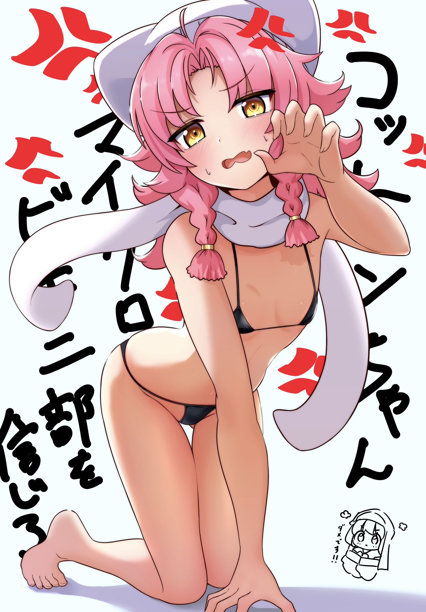 1girlanger veinbikiniblack bikinibraidbreastsclaw posecotton izanai's prophecyfanghathat with earskneelinglong hairlooking at viewerlow twin braidsmicro bikiniopen mouthpink hairscarfshort braidsmall breastssolosweatdropswimsuittwin braidswhite backgroundwhite hatwhite scarfyellow eyes