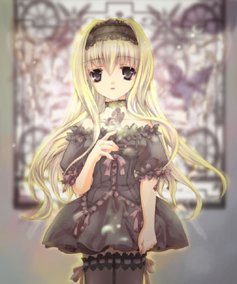 namamo nanase, nagato yuki, suzumiya haruhi no yuuutsu, highres, jpeg artifacts, 00s, 1girl, arm support, black nails, brown eyes, dress, female focus, frills, goth fashion, grey hair, nail polish, short hair, smile, solo, striped clothes, striped thighhighs, thighhighs