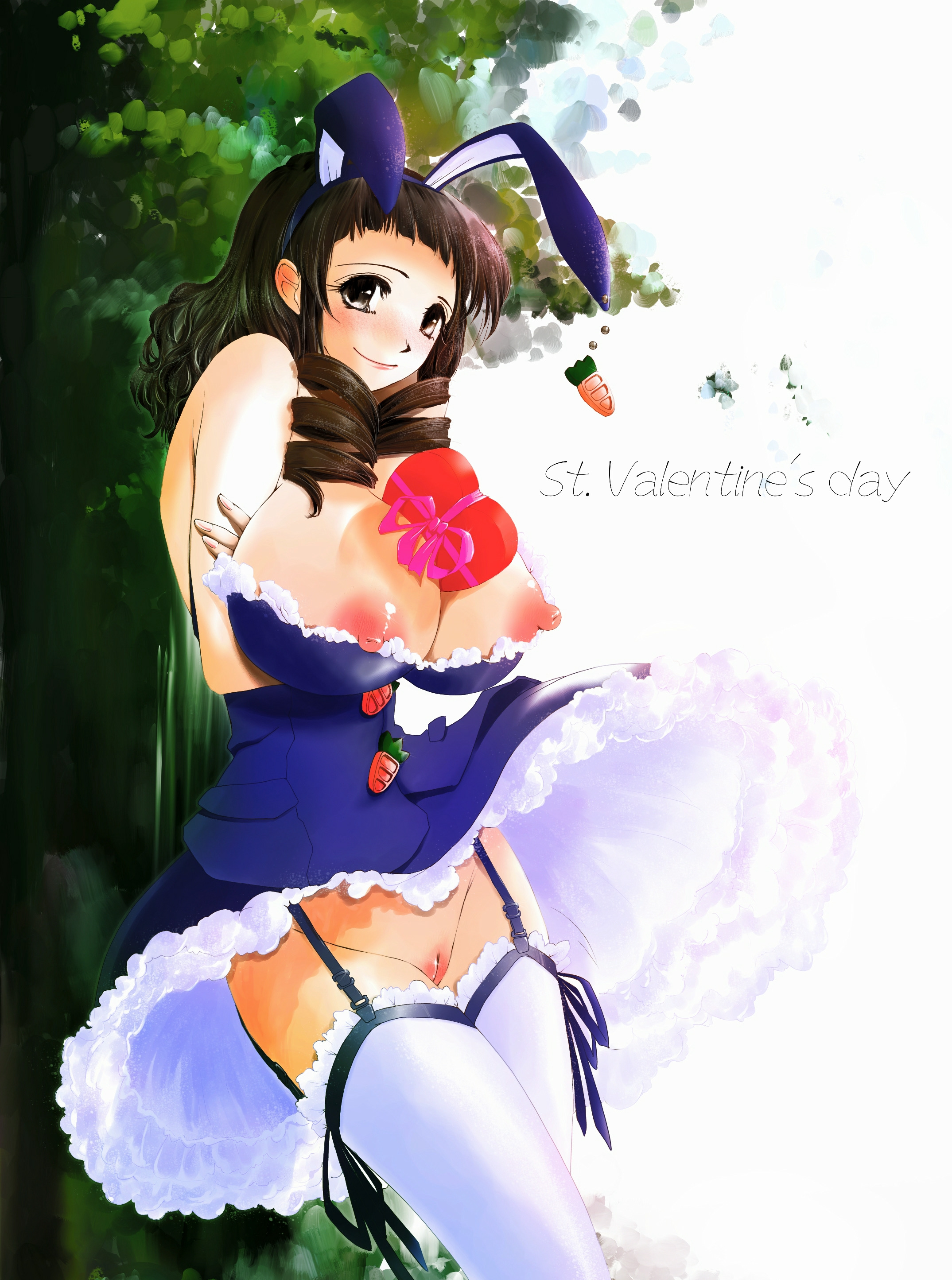 animal earsbetween breastsblushbreastsbrown eyesbrown hairbunny earsfemaleFlag for Deletionheartlong hairlooking at viewernipplesobject between breastsoutdoorspussypussy juicesmilesolothighhighsuncensored