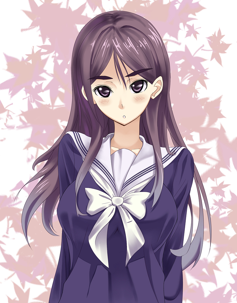 00s1boy1girlblushbowbreastsbrown hairleaflong hairlooking at viewermaple leafopen mouthpurple eyespurple hairschool uniformserafukuupper body