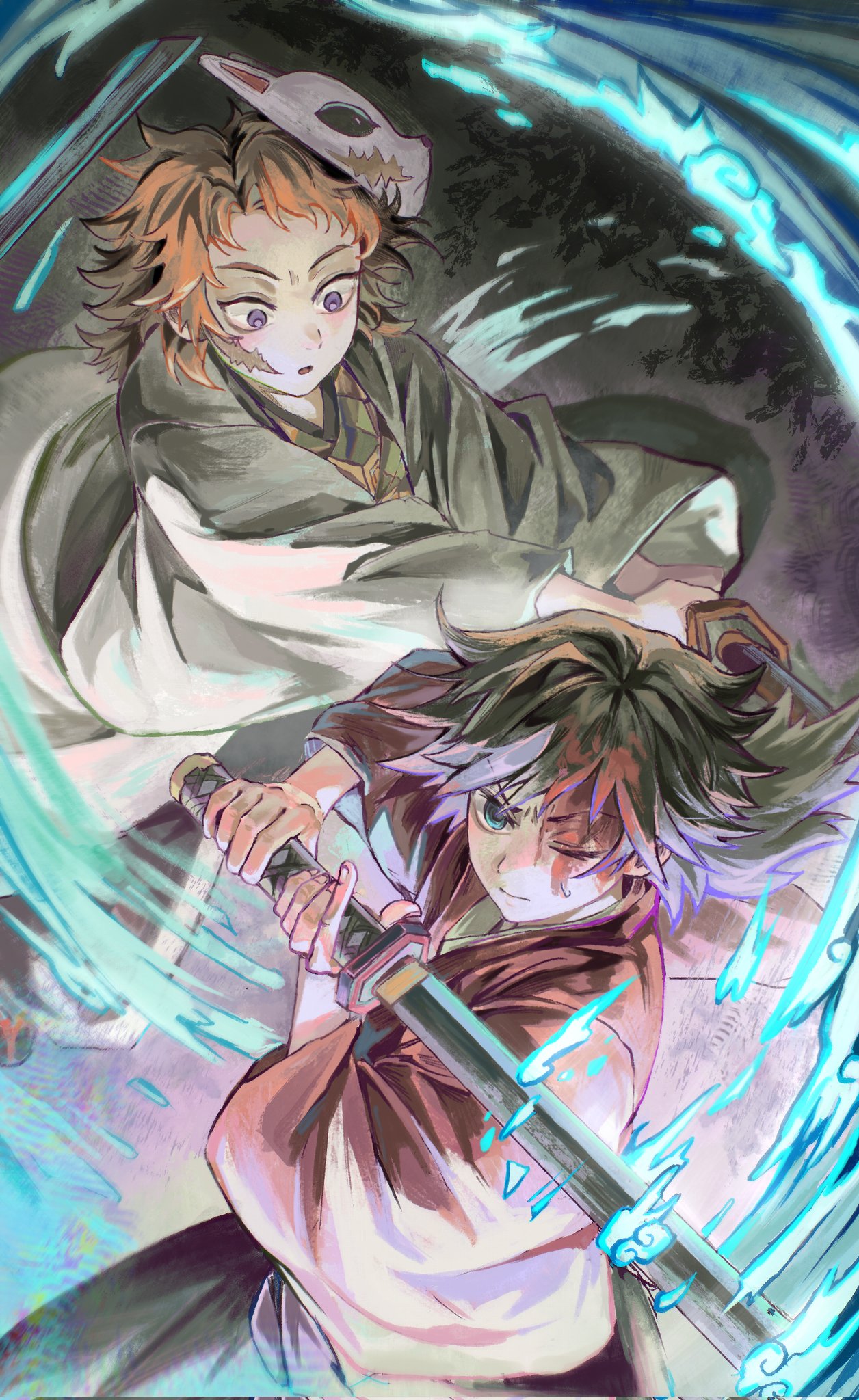 2boysblack hairbloodblood on facefacial scarfox maskhaoriholdingholding swordholding weaponjapanese clotheskatanakikkoumonkimonolow ponytailmale focusmaskmultiple boysone eye closedopen mouthponytailprint kimonored kimonoscarscar on cheekscar on facespiked hairswordtanseiwaterweaponwhite haori