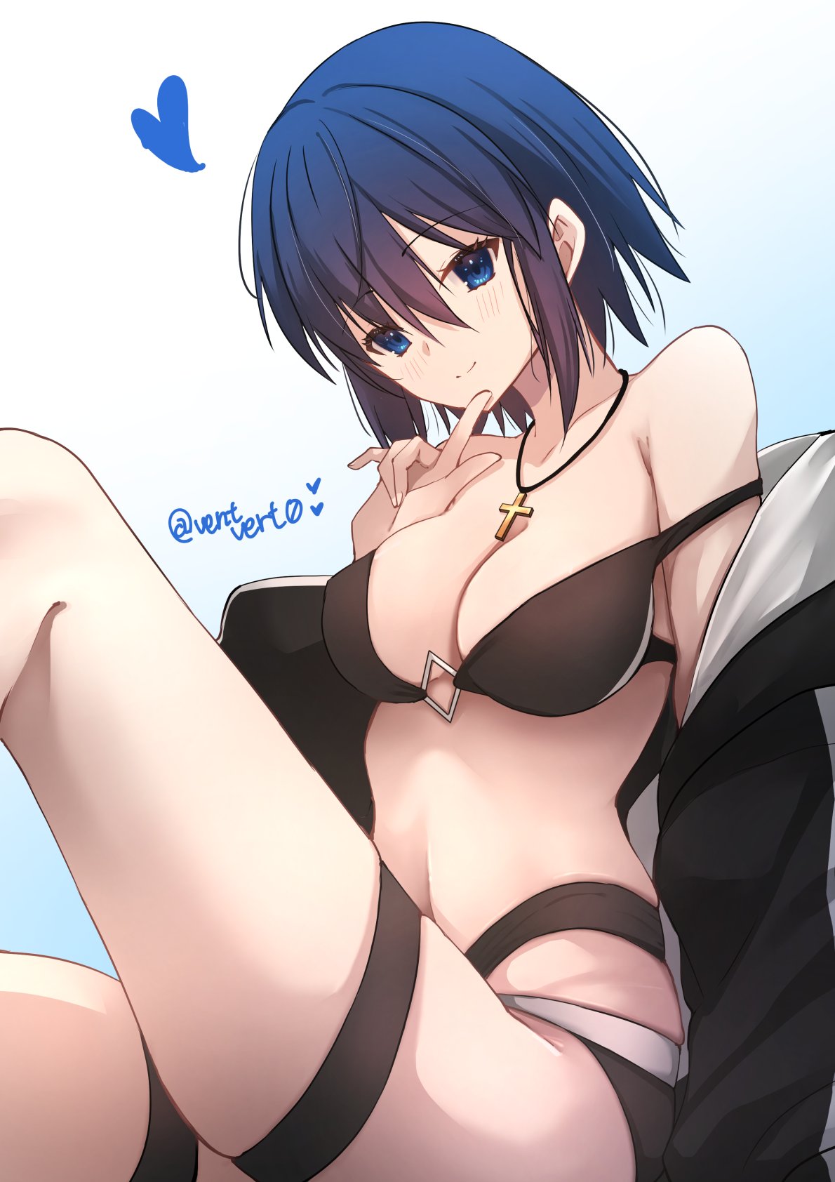 original, highres, black hair, blue halo, halo, leotard, long hair, looking at viewer, magi amagi, messy hair, night, night sky, one eye closed, pale skin, playboy bunny, red eyes, scar, scar on chest, sitting, sky, snowing, windowsill