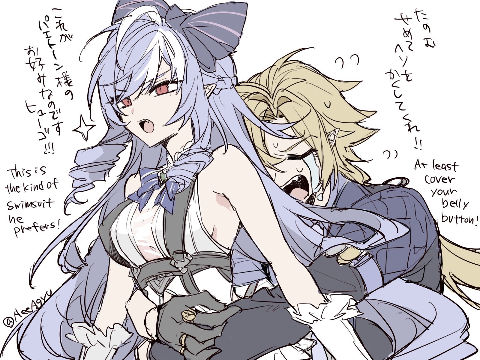 1boy1girlaeeaarm out of sleevearmbandascotbare shouldersblack glovesblonde hairbowbowtiebreastsclosed eyescoatcovering anothercryingdrill hairenglish textfangsgemglovesgold ringhair bowhughug from behindjewelrylong hairmolemole under eyemultiple ringsopen mouthpointy earspurple ascotpurple bowpurple bowtiepurple coatpurple gemstonepurple hairpurple shirtringsee-through clothesshirtsideboobsideboob cutoutsparklesweatswimsuittonguetwitter usernamewhite backgroundwhite wrist cuffswrist cuffs