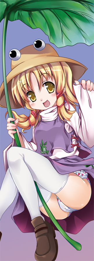 1girlassblonde hairfemale focusfood printfrilled pantiesfrillsfruit printgradient backgroundhatleafpantiesplantprint pantiesskirtsolostrawberry pantiesstrawberry printthighhighsunderwearupskirtyellow eyes