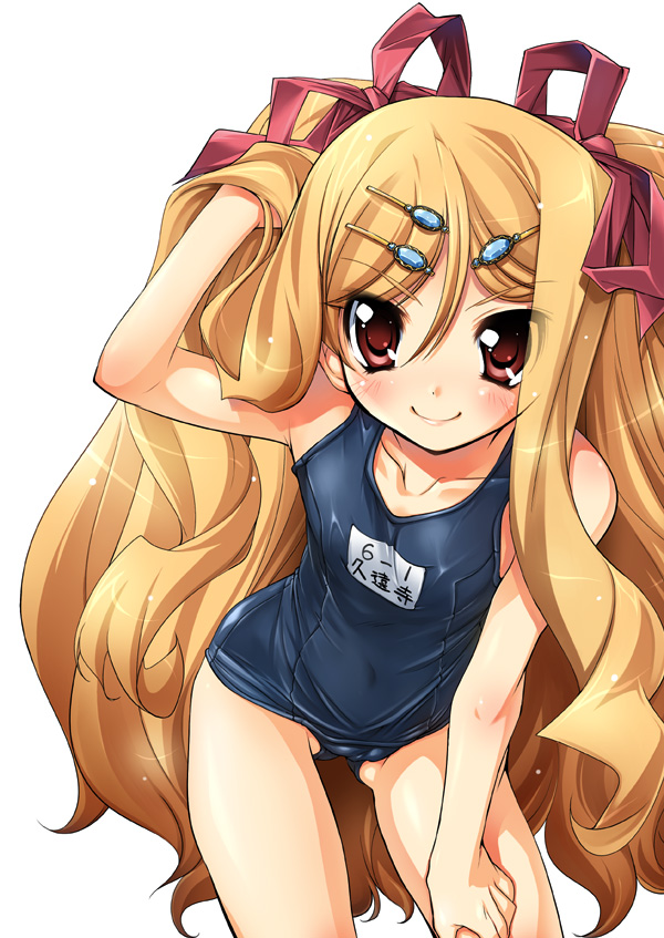 1girlblonde haircameltoefemale focusflat chesthair ornamenthair ribbonhaircliplong hairone-piece swimsuitred eyesribbonschool swimsuitsoloswimsuit