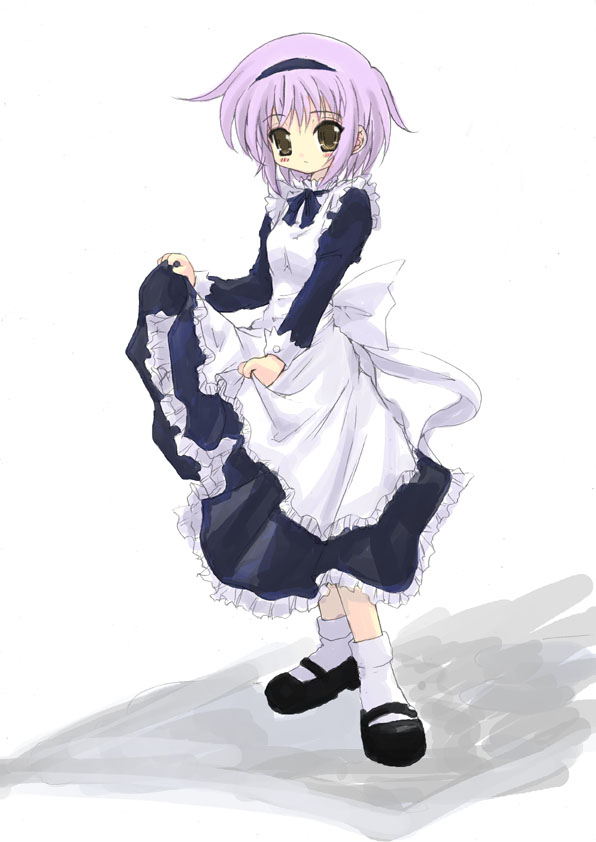 00sapronblushbrown eyesdresshairbandheadbandmaidmaid apronmary janespurple hairshoessockssolostanding