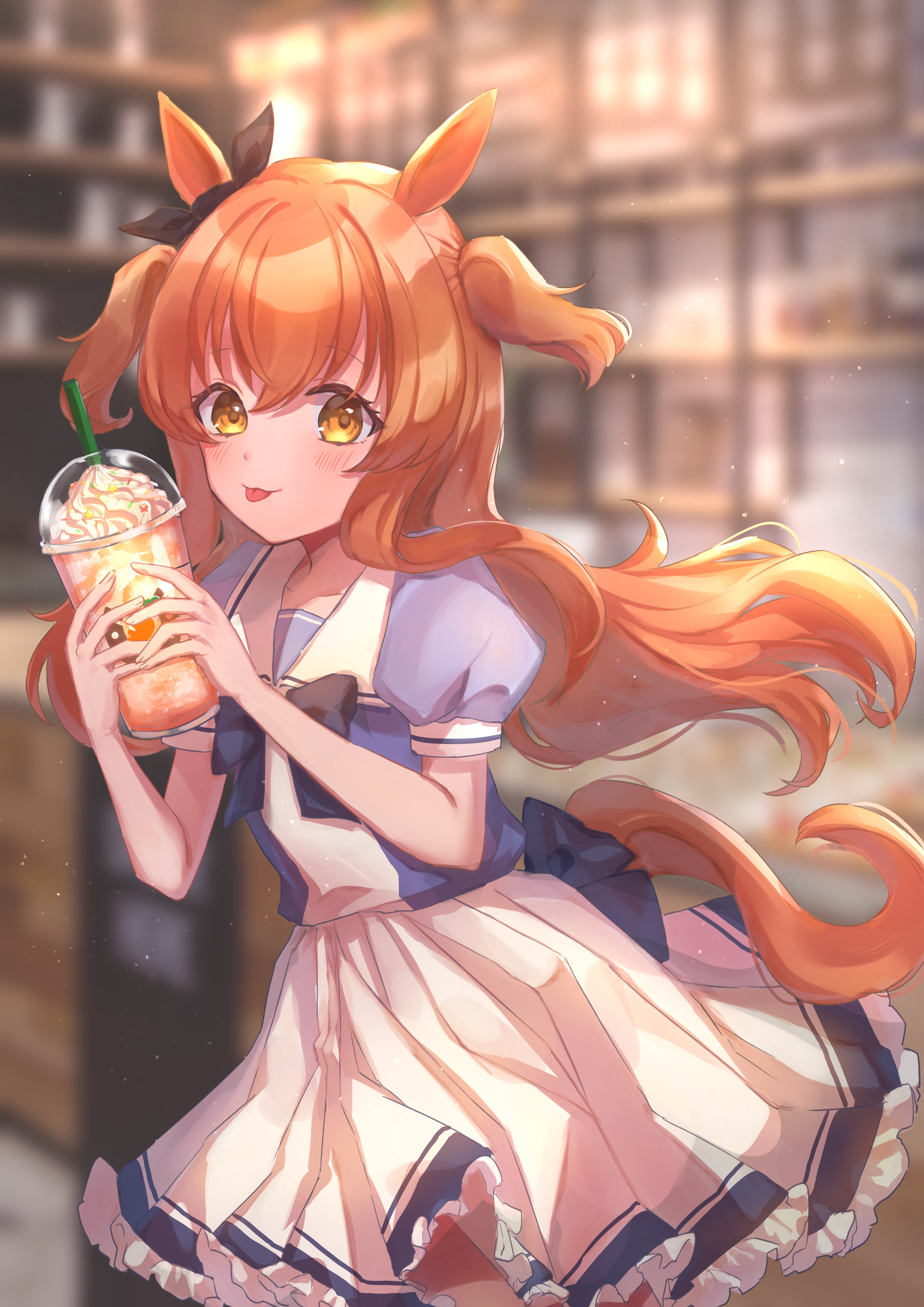 1girlanimal earsback bowblurryblurry backgroundblushbowbowtiebrown ribboncarrot printcowboy shotdrinking strawear bowear ribbonfood printholdinghorse earshorse girlhorse tailhorseshoe ornamentindoorslong hairlooking at viewerorange eyesorange hairorange tailpleated skirtpuffy short sleevespuffy sleevespurple bowpurple bowtiepurple shirtribbonsailor collarschool uniformshirtshort sleevesskirtsmilesmoothiesolotailtonguetongue outtracen school uniformtwo side upwhipped creamwhite skirt