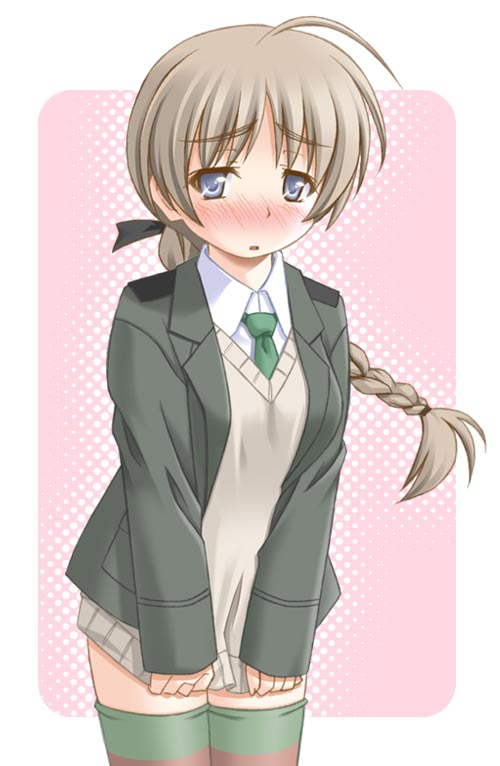 00s1girlblue eyesblushbraidbrown haircovering crotchcovering privatesfemale focusshirt tugsingle braidsolothighhighs