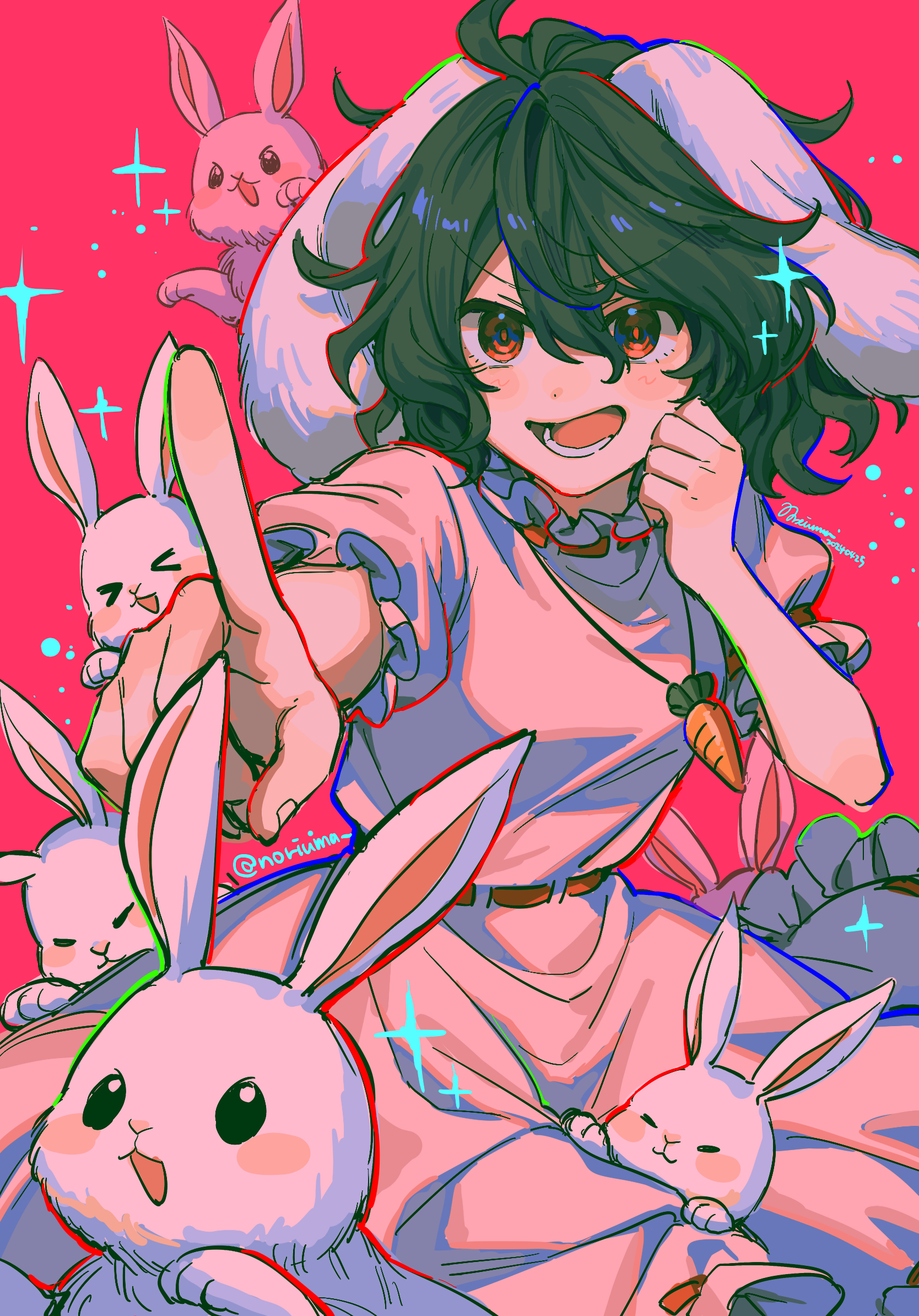 1boy1girlanimal earsartist nameblack hairbreastscarrot necklaceclosed mouthcowboy shotdateddressfloppy earshair between eyesjewelrynecklaceopen mouthpendantpink backgroundpink dresspointingpuffy short sleevespuffy sleevesrabbitrabbit earsrabbit girlred eyesshort hairshort sleevessmilesolosparkletoo manytoo many rabbitstwitter username