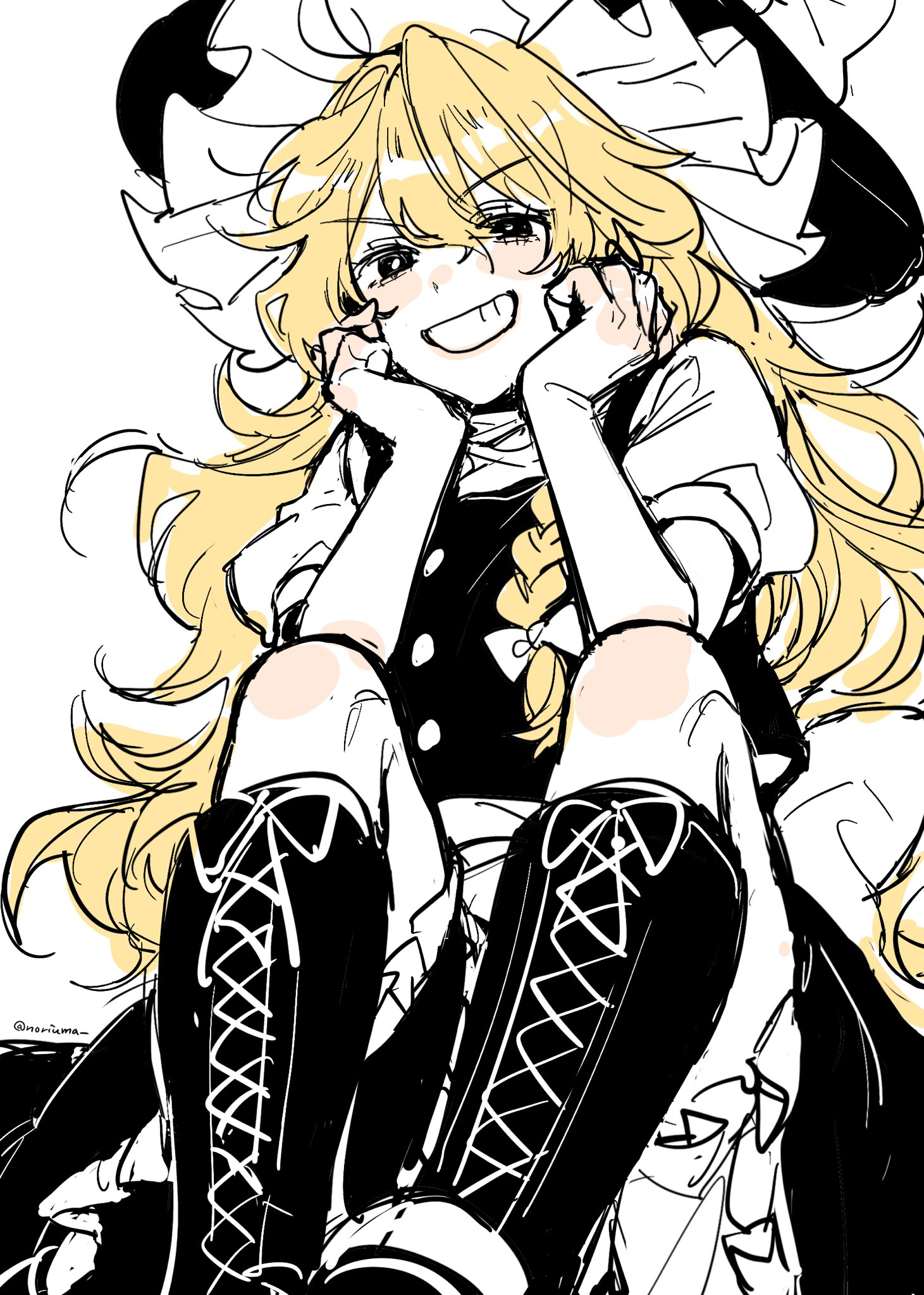 1girlblack bootsblack hatblack skirtblack vestblonde hairbootsbowbraidfrilled skirtfrillsgrinhair bowhands on own cheekshands on own facehathat bowlace-up bootslong hairlooking at viewerpuffy short sleevespuffy sleevesshirtshort sleevesside braidsimple backgroundsingle braidskirtsmilesolovery long hairvestwhite backgroundwhite bowwhite shirt