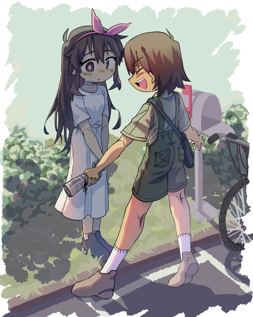 1boy1girlaged downalternate costumebicycleblack hairblack shoesbright pupilsbrown eyesbrown hairchokercollared shirtdark skindark-skinned maledressgreen overallsgreen shirthairbandholdingholding newspaperhuasuan69416long hairlooking at anothermailbagmailbox (incoming mail)newspaperopen mouthoutdoorsoverall shortsoverallsparted lipspink hairbandshirtshoesshort hairshort sleevessocksstandingteethupper teeth onlywhite chokerwhite dresswhite pupilswhite socks