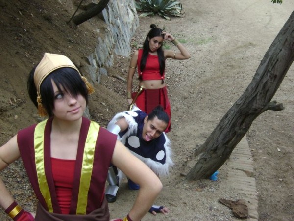 1boy2girlsbreastscosplaygloveskatara (cosplay)midriffmultiple girlssleevelesssokka (cosplay)tonguetoph beifong (cosplay)