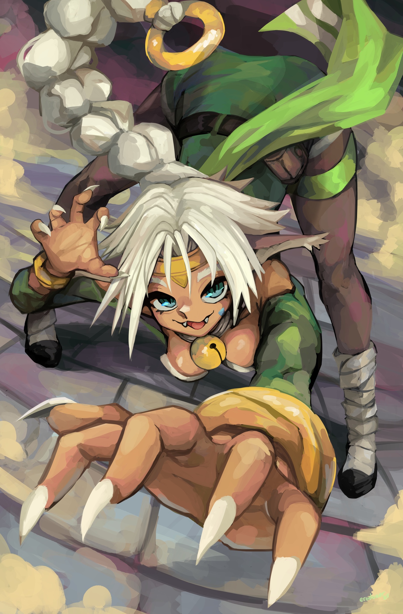1girlbellbent overblack pantyhoseblue eyesbraidbraided ponytailbreastscircletclaw posedark skindark-skinned femaledressfingernailsfull bodygreen dressjingle belllong hairlooking at viewermedium breastsneck bellopen mouthpantyhosepointy earssmilesolotop-down bottom-upwhite hairwhite nails