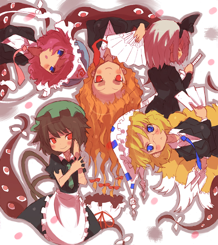 5girlsalternate costumeanimal earsbespectacledblonde hairblue eyesbonnetbowbrown haircat earscat girlcat tailenmaidedfemale focusformal clothesfox tailgap (touhou)glasseshair ribbonhand fanhatkunaimaidmultiple girlsmultiple tailsnecktiepurple hairred eyesribbonsuittailunworn hatunworn headwearweapon