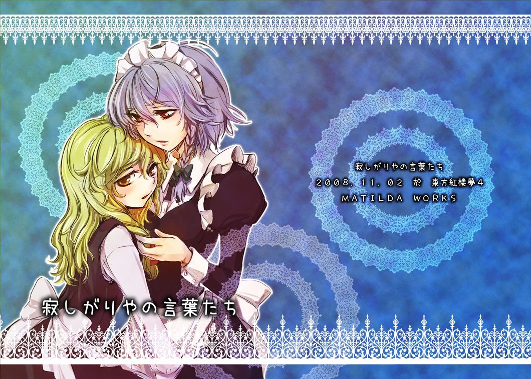 2girlsapronblack dressblonde hairbraidbrown eyesdressfemale focusfrillshuglong hairlong sleevesmaid headdressmultiple girlstext focustwin braidswavy hairyuri
