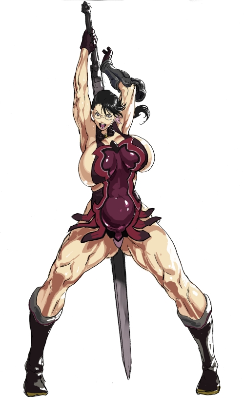 00s1girlblack hairbootsbreastsfemale focusfull bodyglassesgloveshuge breastshuge weaponmature femalemuscularmuscular femalerevealing clothessimple backgroundsolostandingswordweaponwhite background