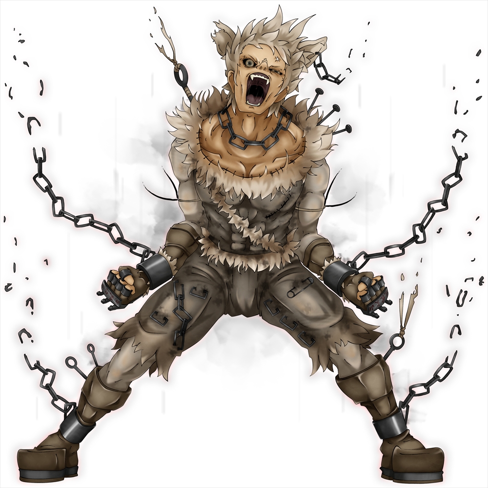 1boyabsanger veinbrokenbroken chainbrown shoeschainclenched handfull bodyfur trimgen 1 pokemonkunaimale focusopen mouthpersonificationsafety pinshoesshortssolostandingtonedtoned maleweaponwhite backgroundwhite hair