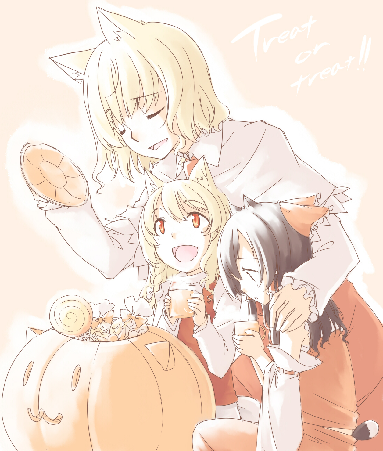 :33girlsanimal earscandycat earscat girldetached sleevesfemale focusfoodhalloweenjack-o'-lanternjapanese clothesmikomultiple girlspumpkinshort hair