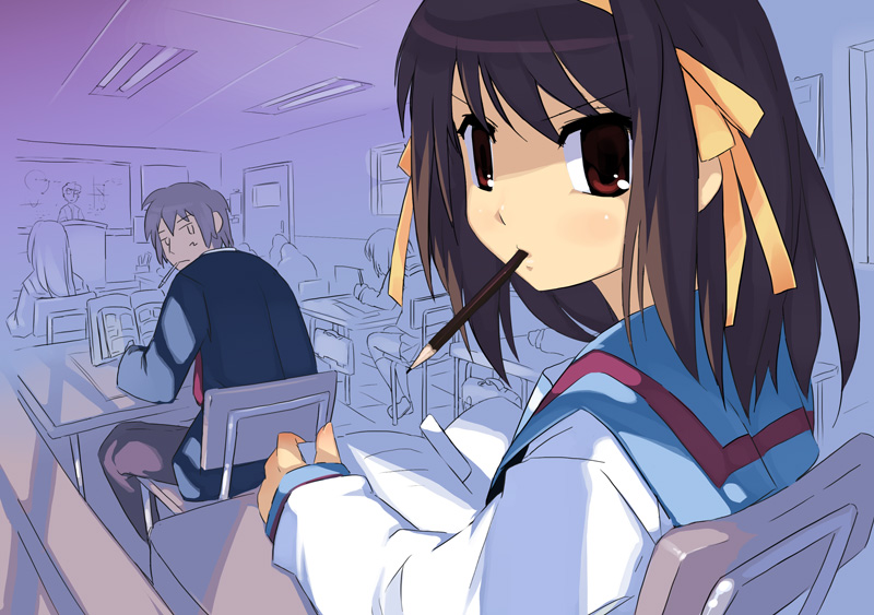 00sbookbrown eyesbrown hairclassroomhairbandlooking backmouth holdschoolschool uniformserafukushort hairsitting